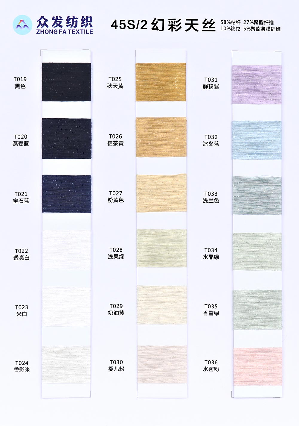 58%粘纤Viscose 27%涤纶Polyester 10%锦纶Nylon 5%聚酯薄膜纤维Polyester Film Fiber