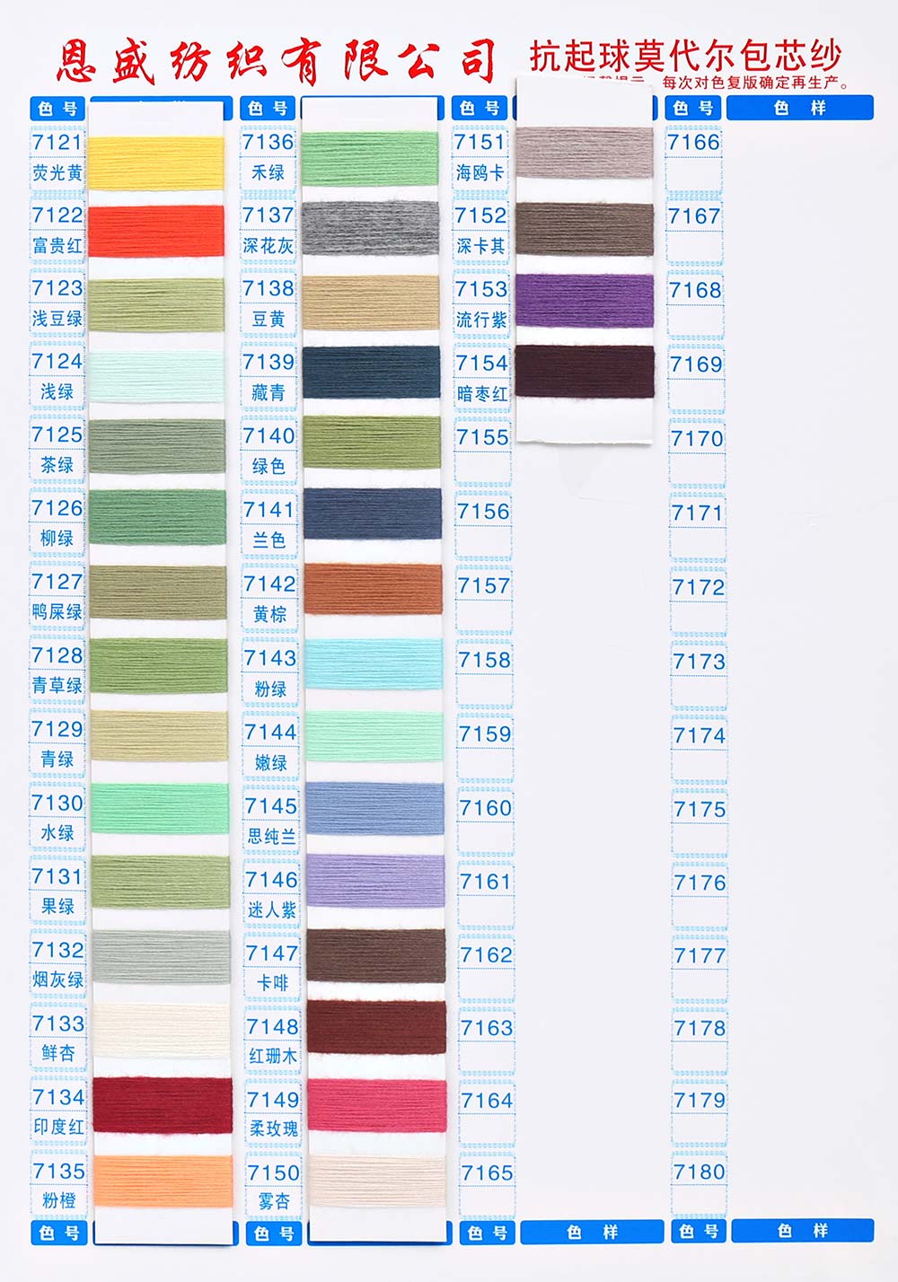 有色丝光棉,有色冰爽丝,有色仿亚麻,有色双曲,有色天丝,有色兔绒/高弹包芯纱,有色莫代尔包芯纱,有色安哥拉北极绒,有色羊毛纤弹绒,银丝亲肤绒,有色安迪绒,有色仿棉,半精梳棉纱,有色羊毛混纺,有色鹿毛绒,1.3公分不掉毛仿貂