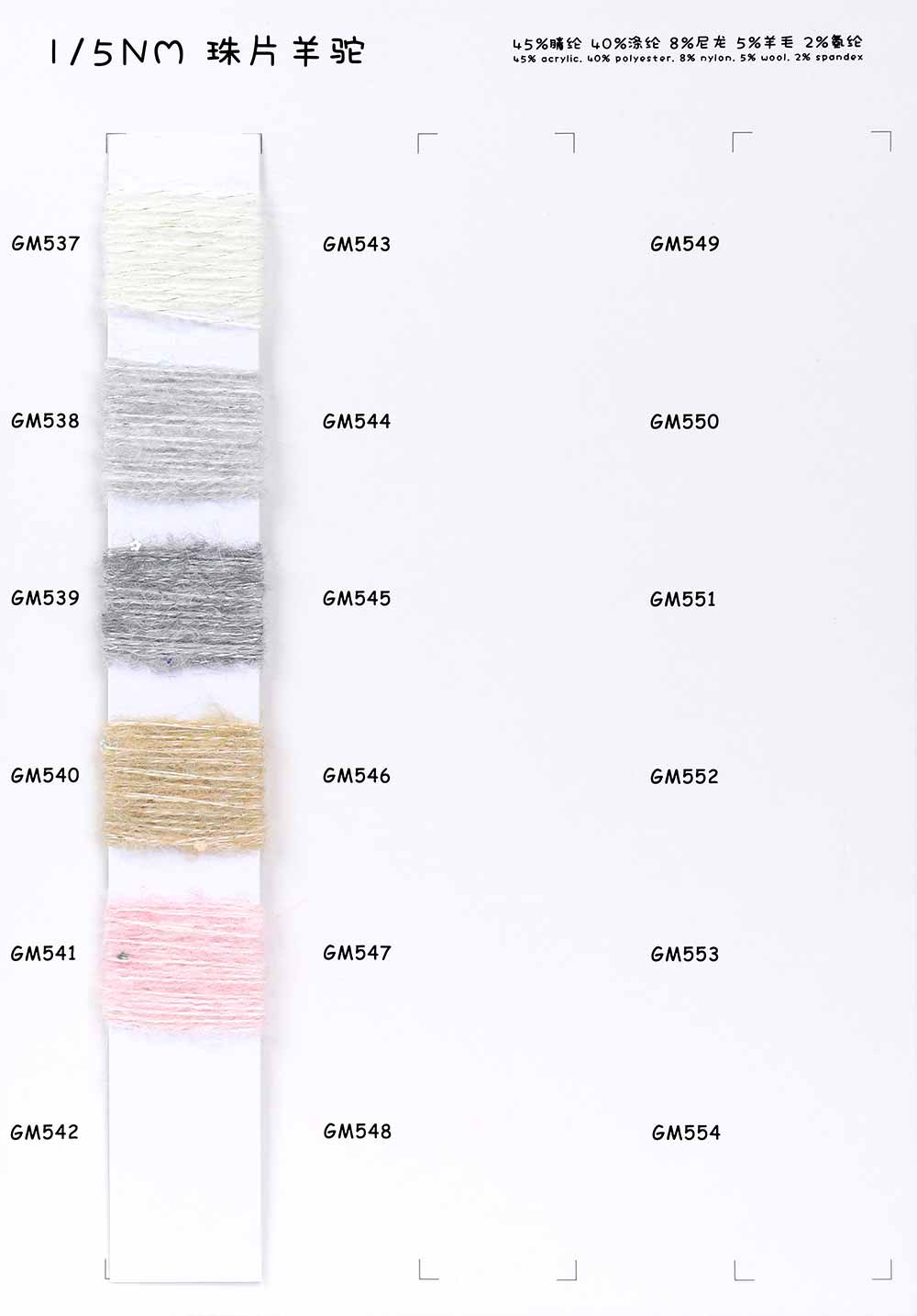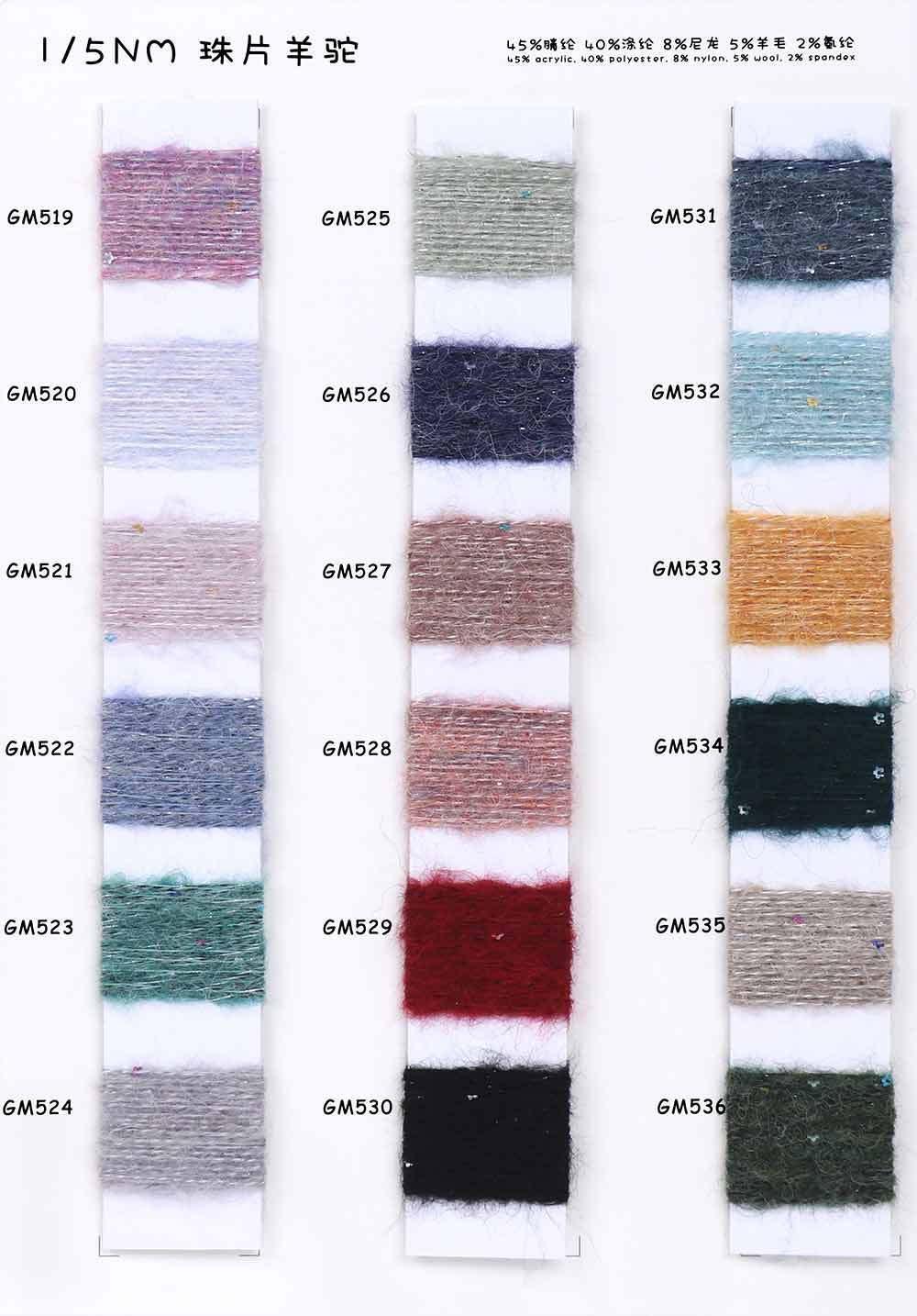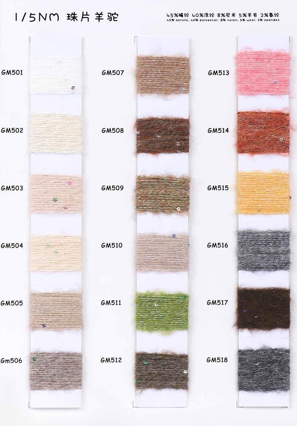 45%腈纶Acrylic 40%涤纶Polyester 8%尼龙Nylon 5%羊毛Wool 2%氨纶Spandex